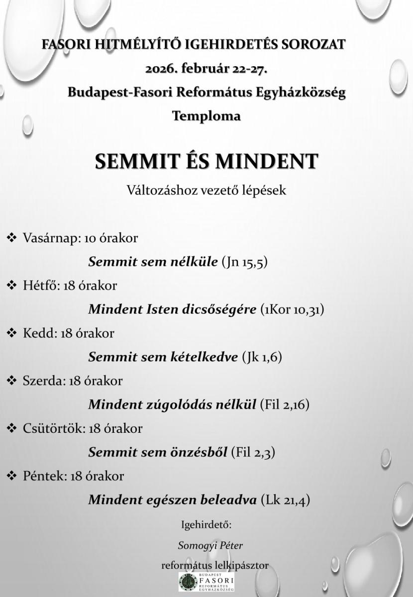 Fasori hitmélyítő igehírdetés sorozatot tartunk 2026. február 22-től 27-ig a Budapest-Fasori Református Egyházközség Templomában SEMMIT ÉS MINDENT címmel. Igehírdető Somogyi Péter református lelkipásztor