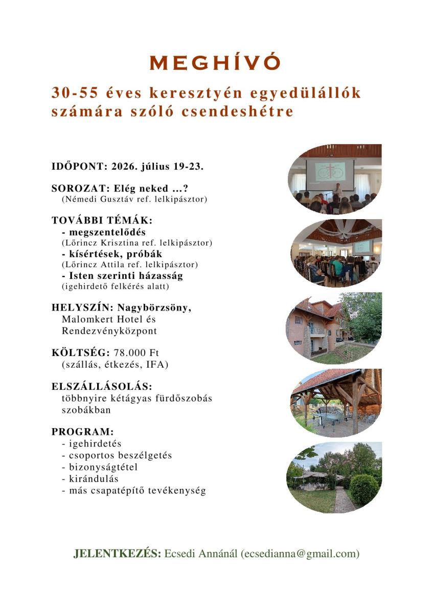 Meghívó 30-55 éves keresztyén egyedülállók számára szóló csendeshétre! Kérjük mihamarabb jelentkezz, várunk szeretettel.