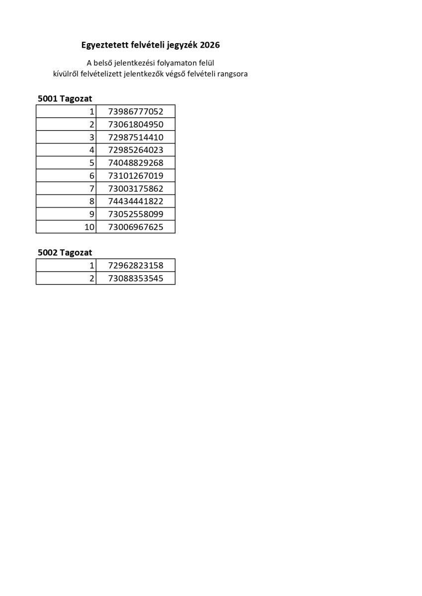 EGYEZTETETT FELVÉTELI JEGYZÉK