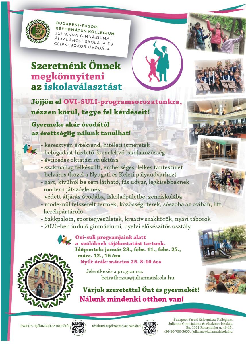 A Julianna Református Általános Iskola szeretettel várja valamennyi évfolyamára mindazok jelentkezését, akik az itt képviselt értékek mentén kívánják nevelni gyermekeiket.